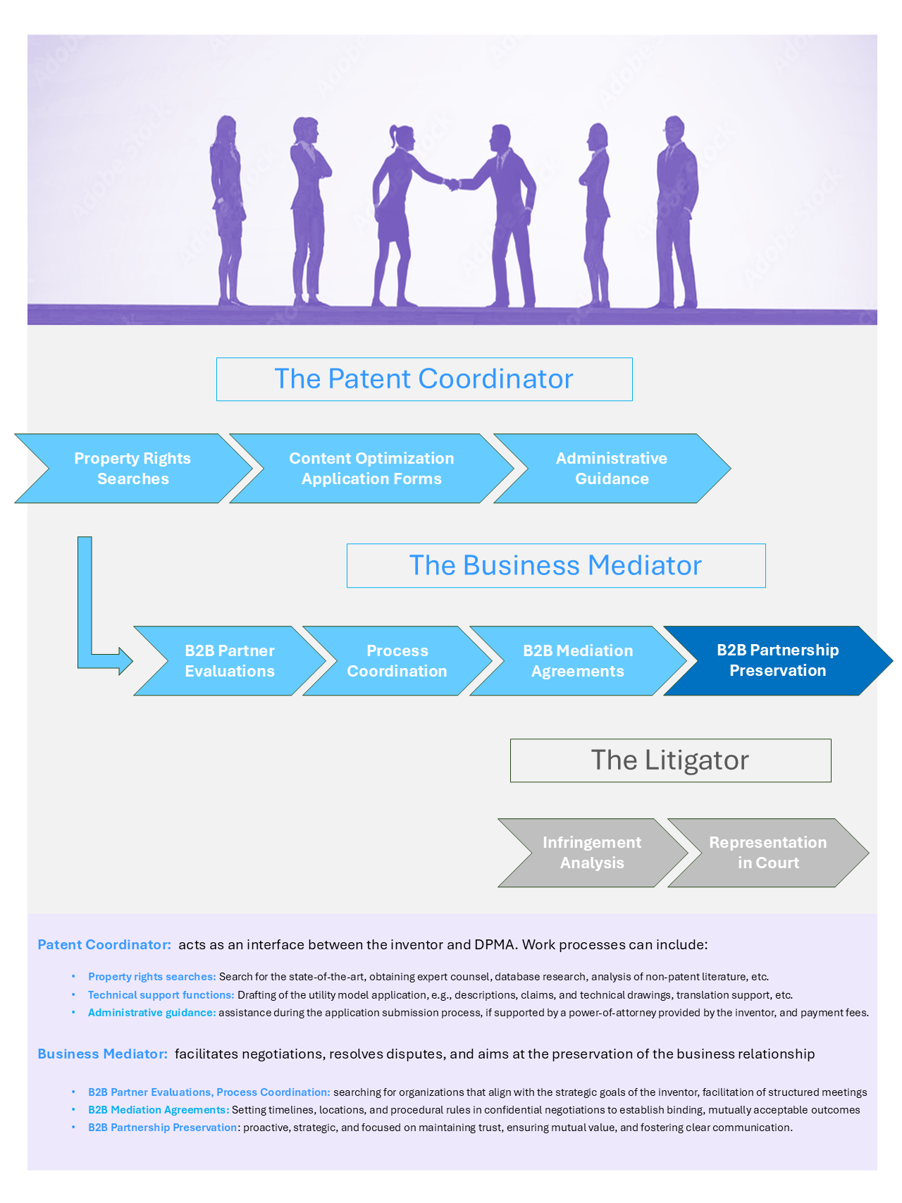 - Focused on the development and preservation of successful, long-term business relationships, our company does not provide litigation services. Should you seek representation in court, we can refer you to a litigator.
