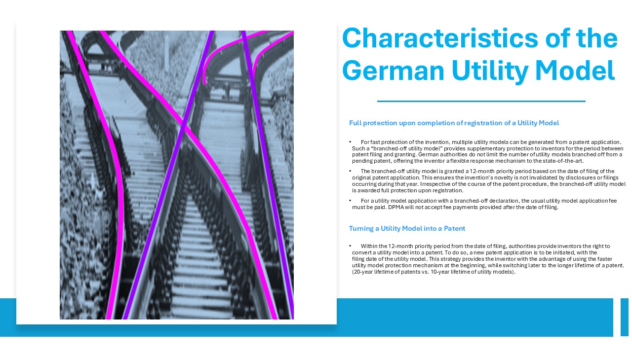within 2 months with the German Patent and Trademark Office (DPMA), the utility model provides an enforceable, patent-like right immediately upon registration for products and devices. - The claims of a branched-off utility model can be “tailored” broader, narrower,